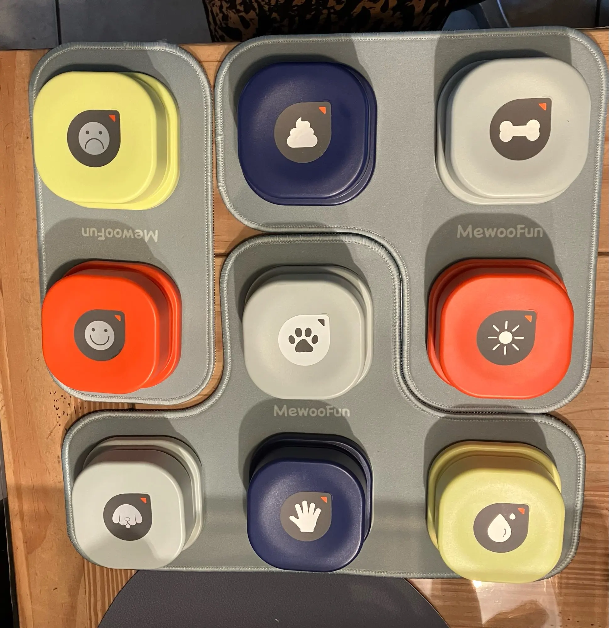 - DOG TALKING BUTTONS WITH MAT: The dog recordable button is an interesting communication tool. Recording any message or commands to repeatedly train your dog and teach them how to express their mind. Buttons can be securely fastened to the Dog Talking Button Pad to avoid sliding on the floor or mat